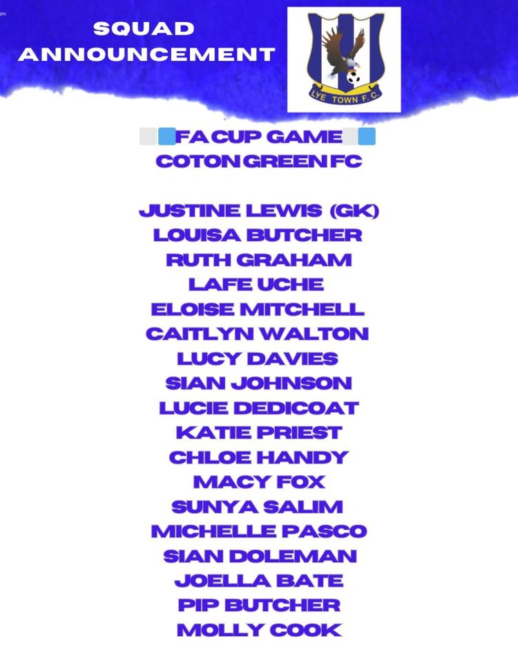 Today Lye will be looking to build on their perfect start to the league season by having a good run in Women’s FA Cup, as they take on Coton Green Ladies away from home.
